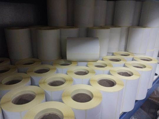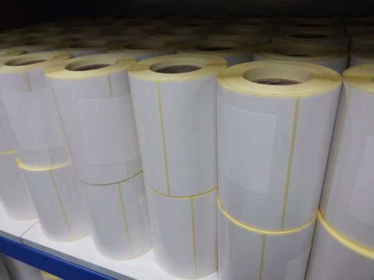 Термотрансферные этикетки — полуглянцевые, полипропиленовые белые, печать на них происходит с помощью красящей риббон-ленты.